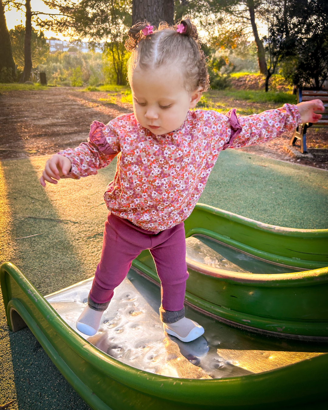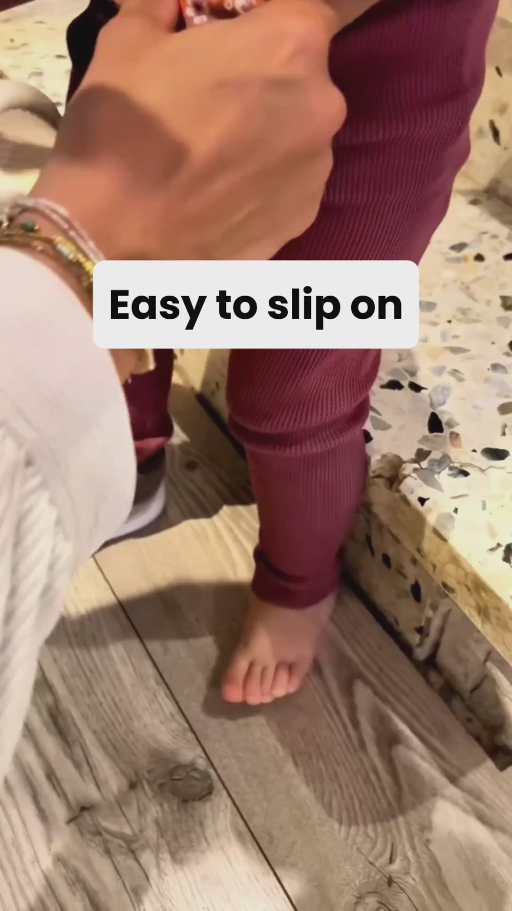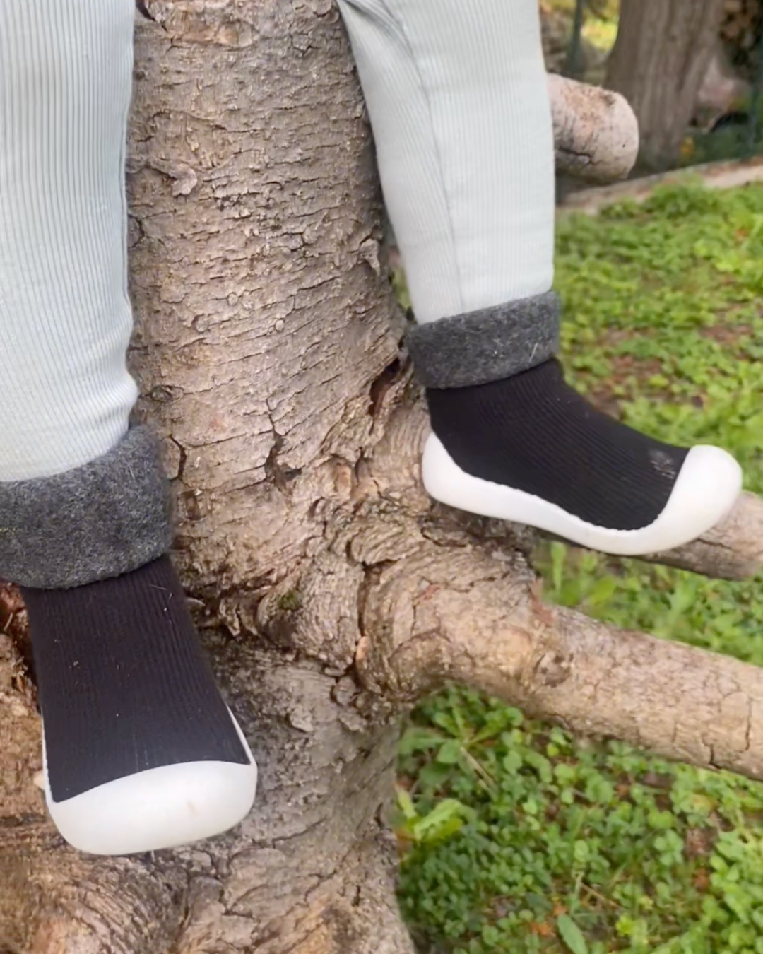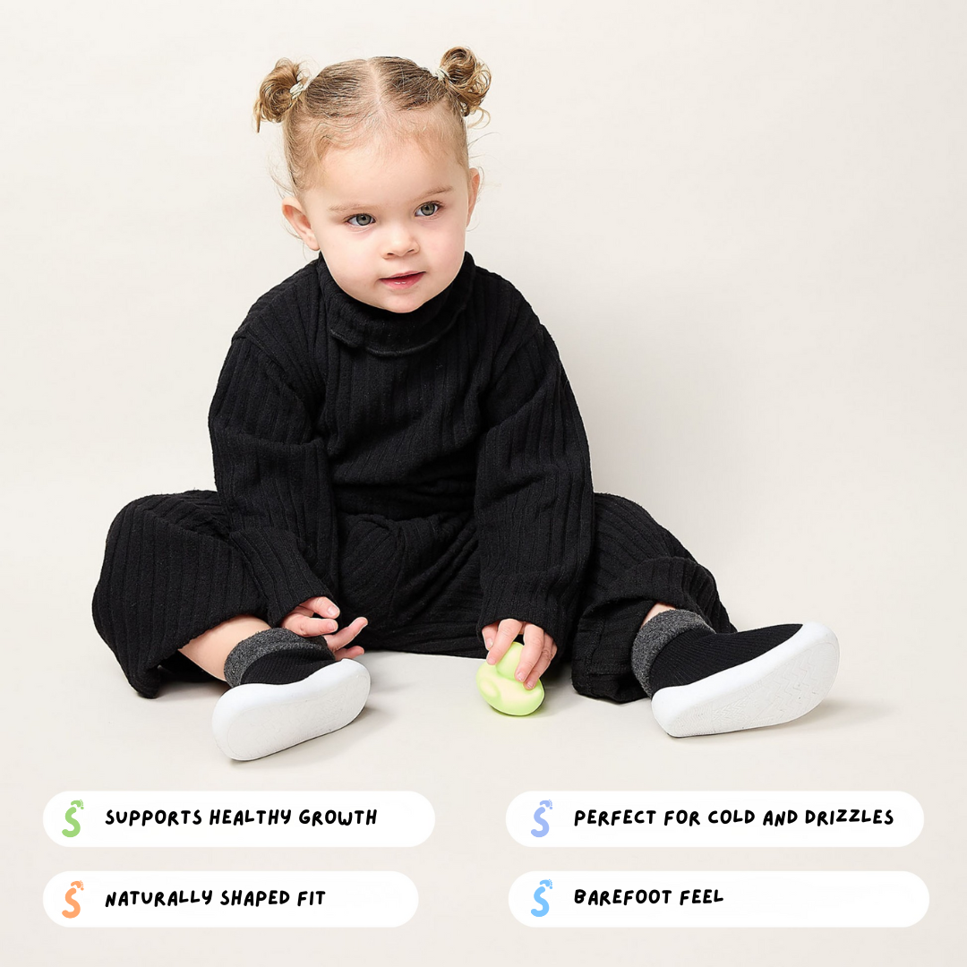 No stiff bits. Just a thin, grippy sole and extra toe room so first steps feel natural, indoors and out.